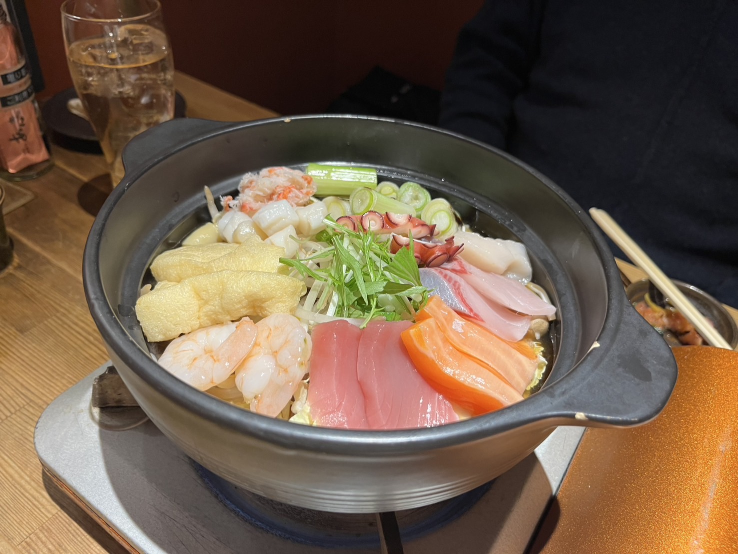 タコ、貝柱、エビなどの海鮮の他に、もやしや白菜、水菜などの野菜もたっぷり。タコやエビはプリップリで、野菜には醤油ベースのスープが染みこんで、噛むたびにあふれ出てきます。