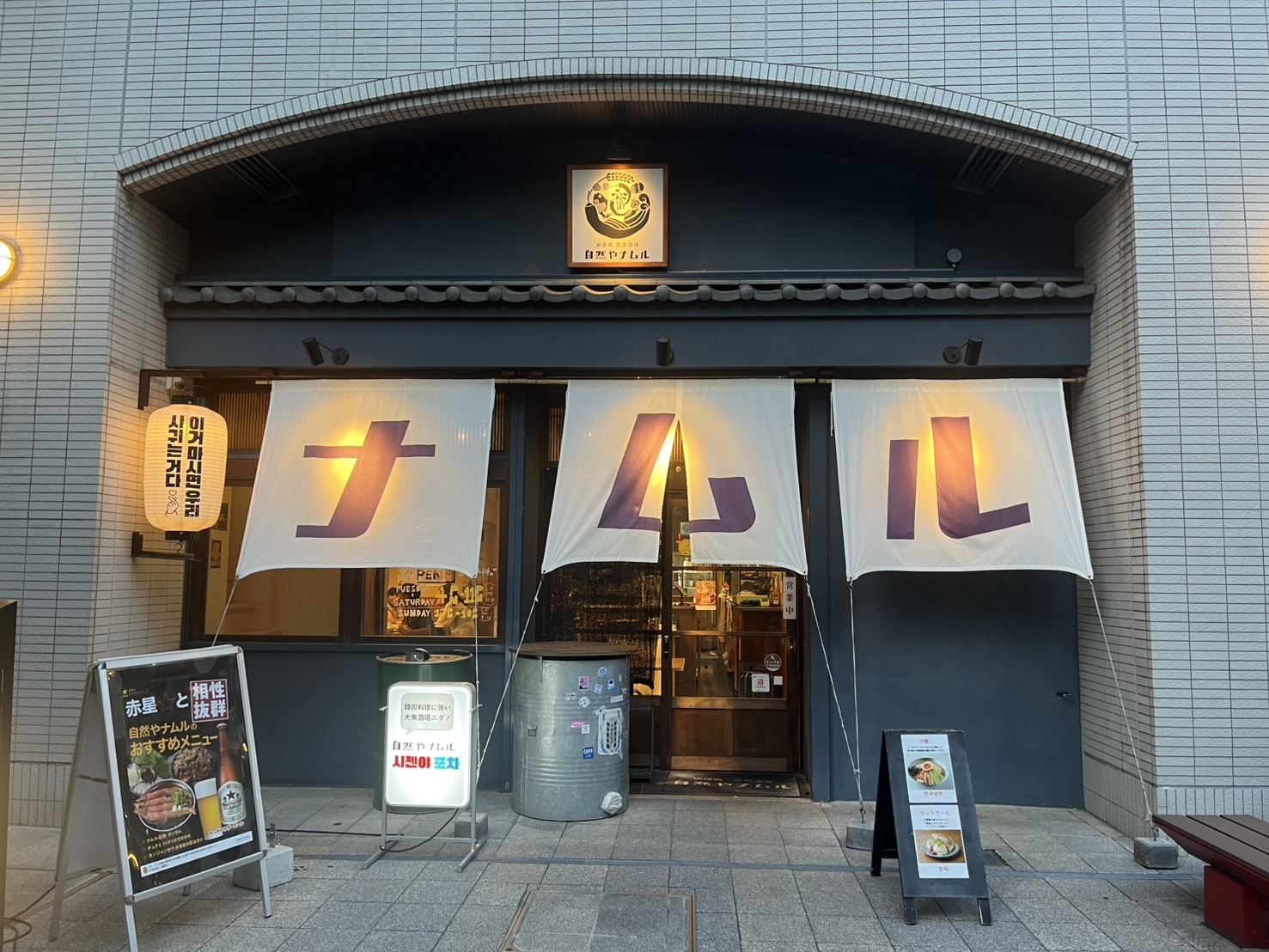 名古屋駅から徒歩5分のところにある、ナムルと大きな暖簾が目を惹く韓国居酒屋。