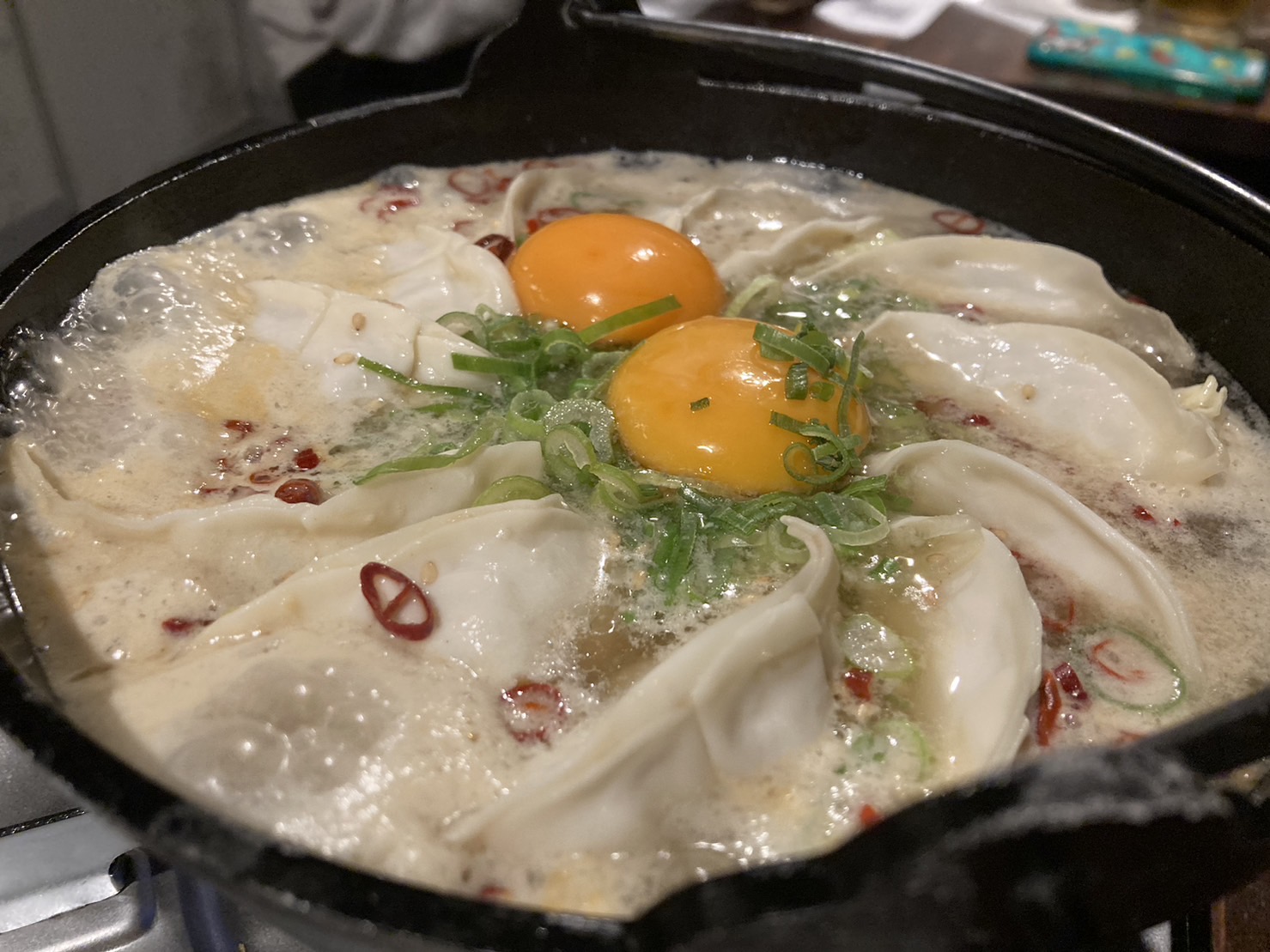 餃子がびっしりと敷き詰められた「かっちゃん鍋」はボリューム満点!白湯味は中華風の食欲そそるにおいが立ち上ります。