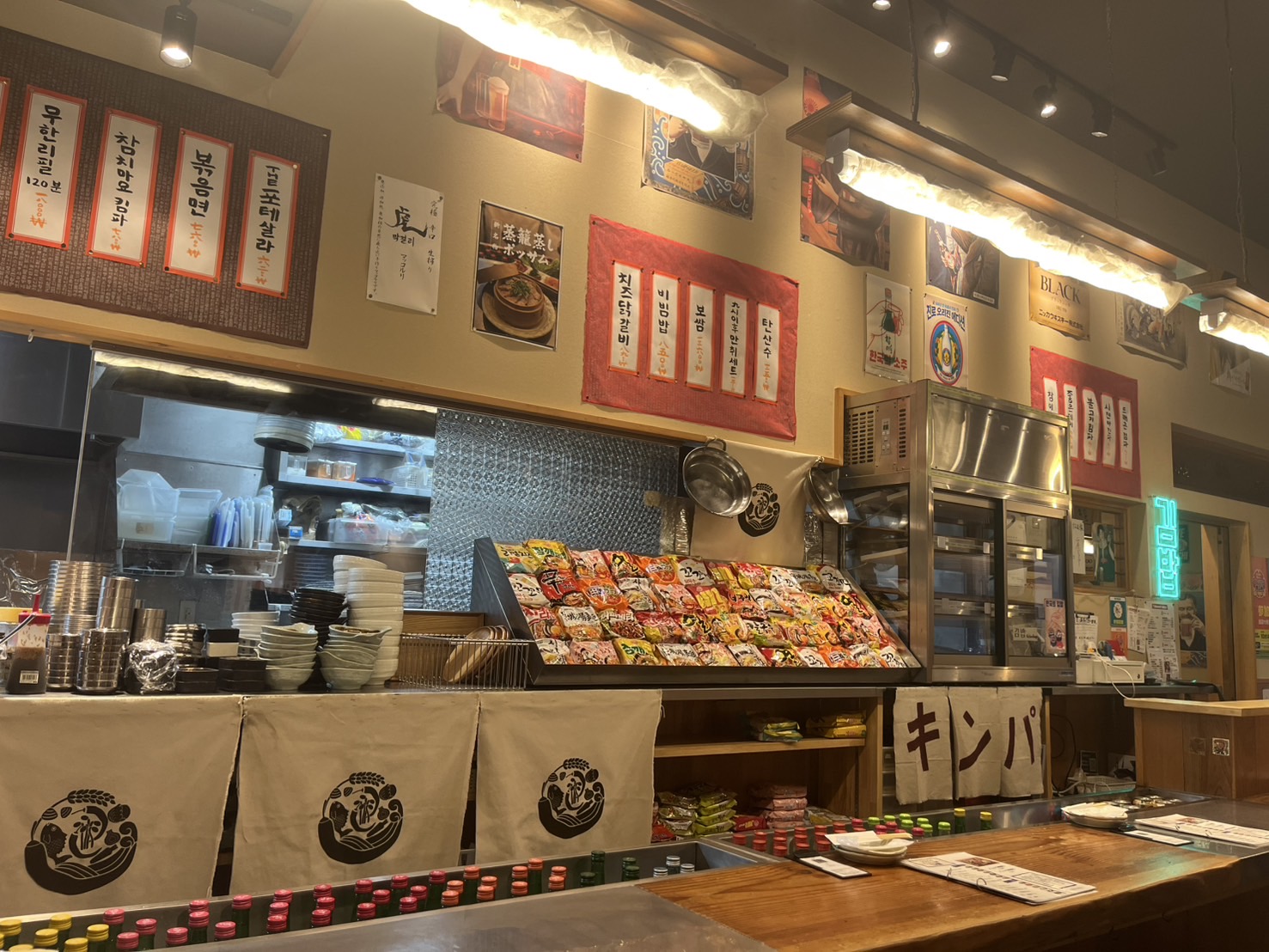 店内に入ってまず視界に飛び込んできたのは、壁に並んだ、ハングル文字で描かれたメニューたち。カウンター席もテーブル席もあって、たくさんのお客さんで賑わっていました!