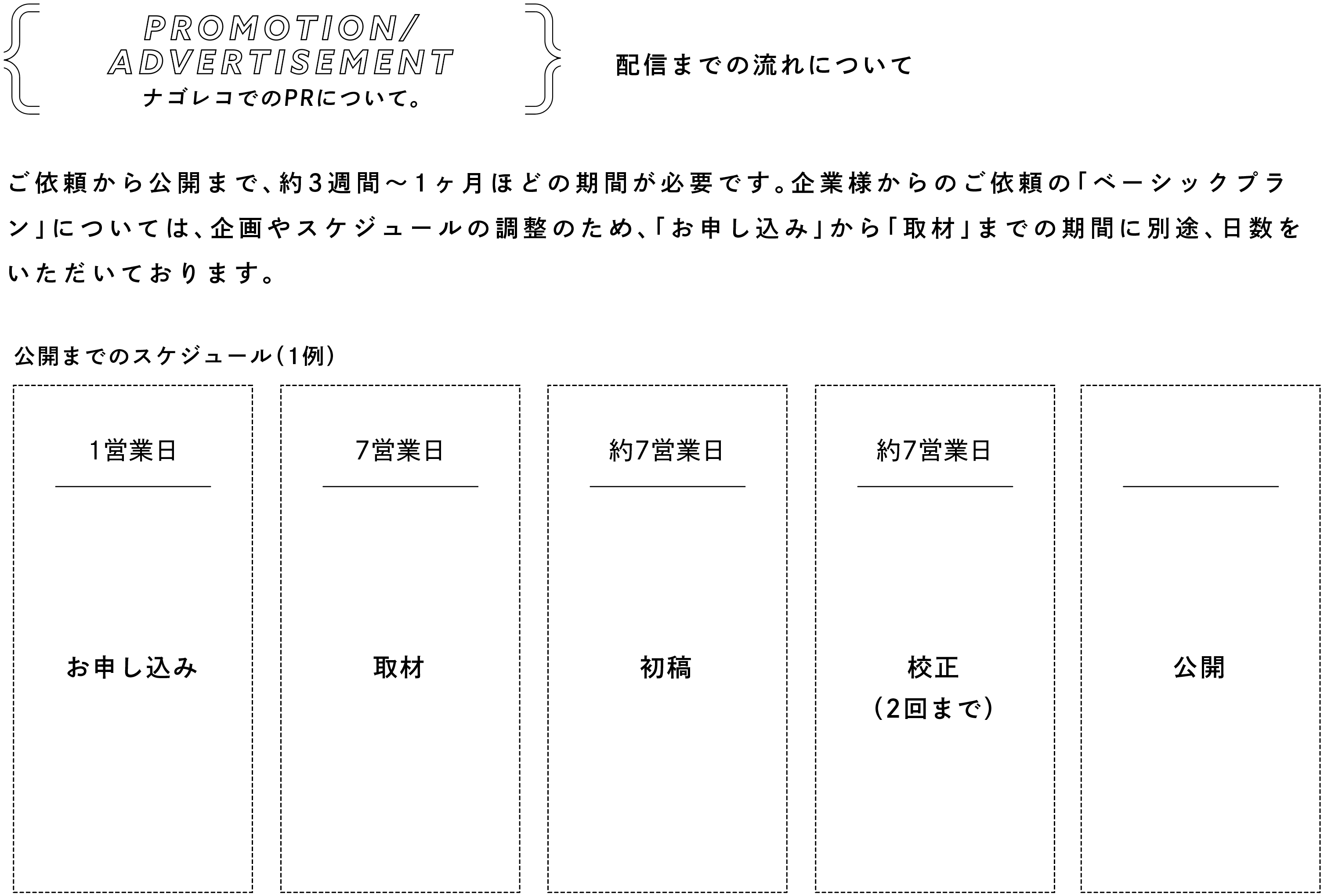 ナゴレコへの掲載スケジュールです。お申し込みから3週間〜1ヶ月ほどで公開することができます。(編集部の状況や企画内容によて前後します)