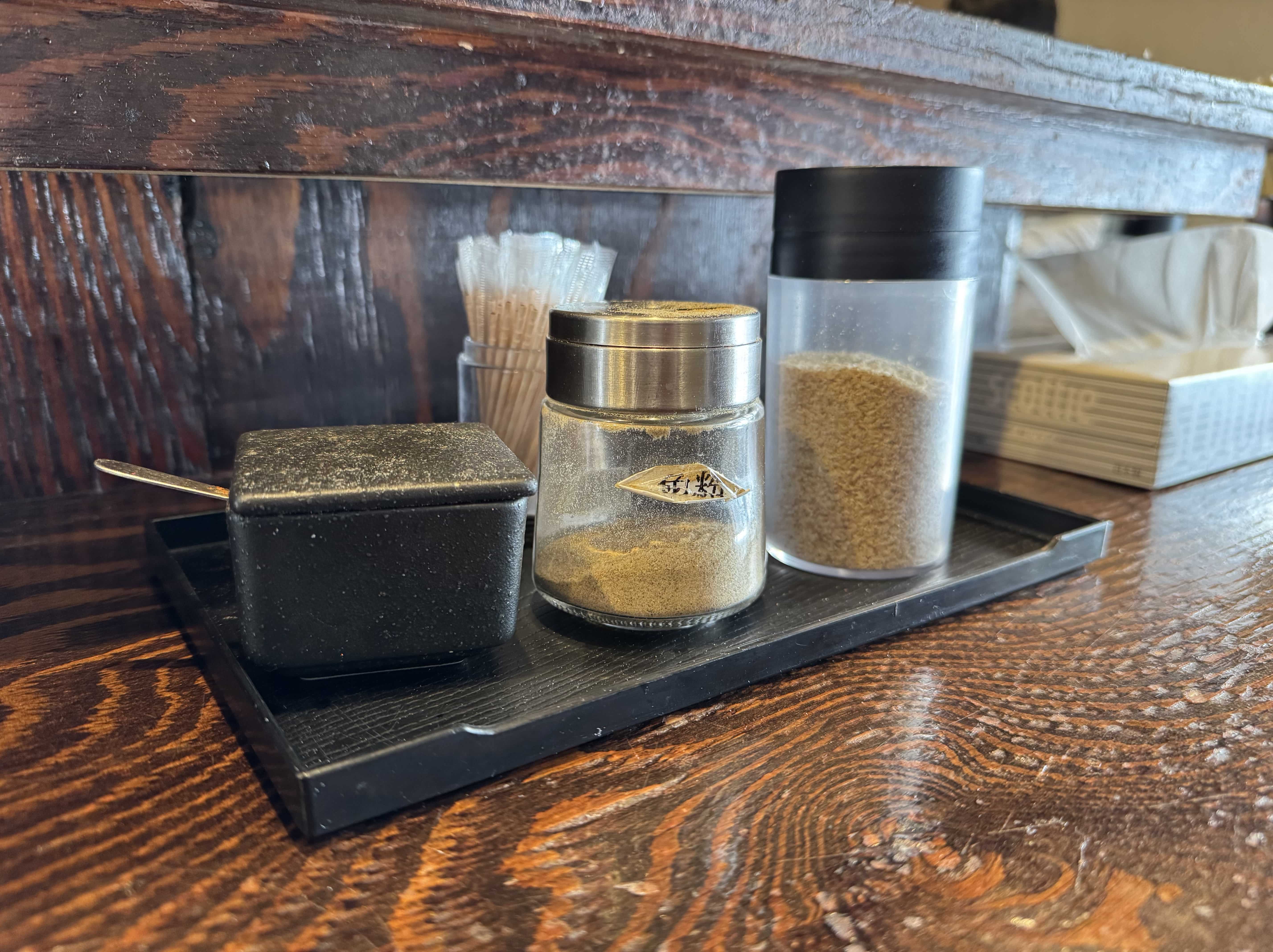 卓上には一味、魚粉、すりごまと味変グッズが揃います。