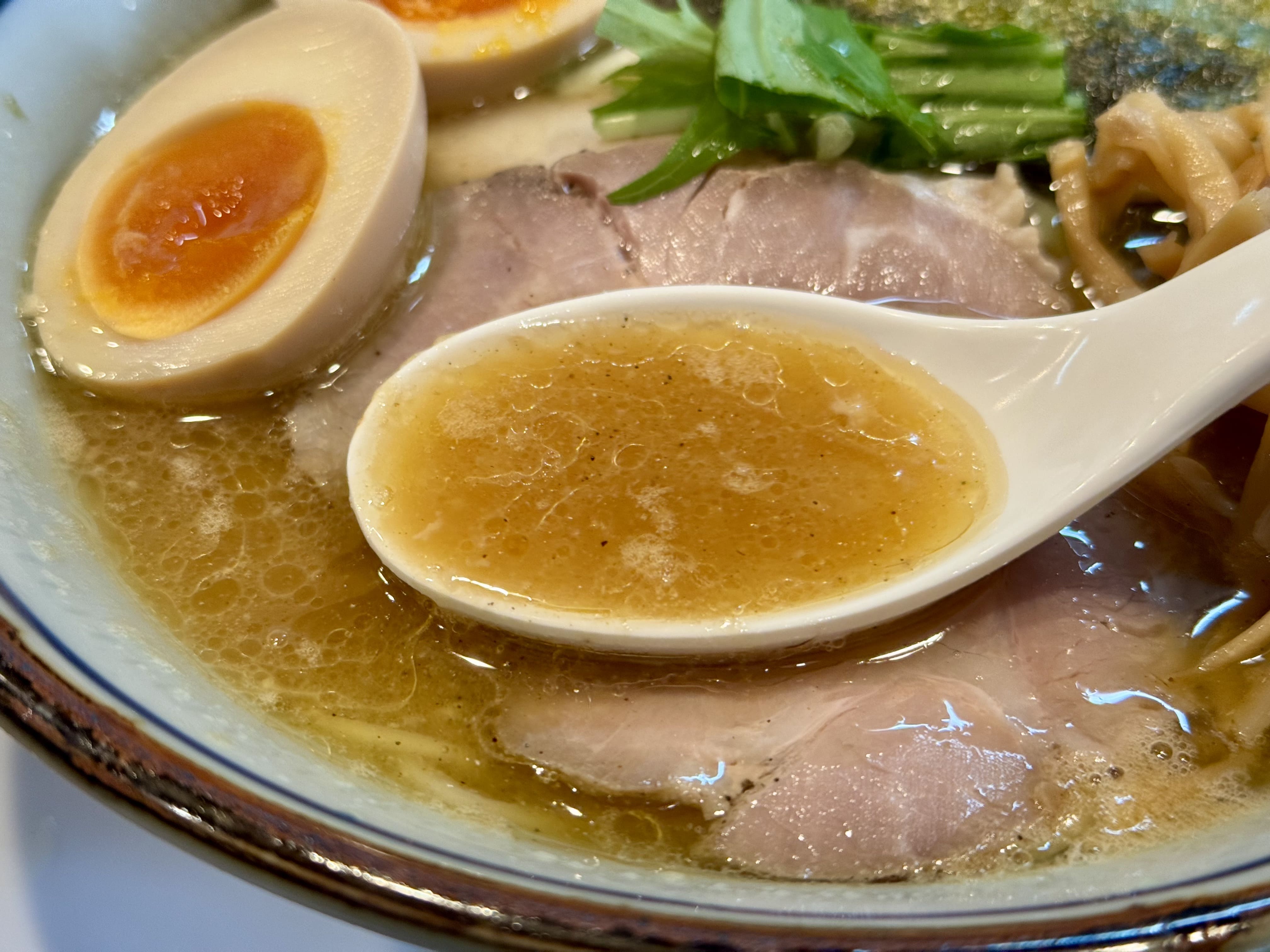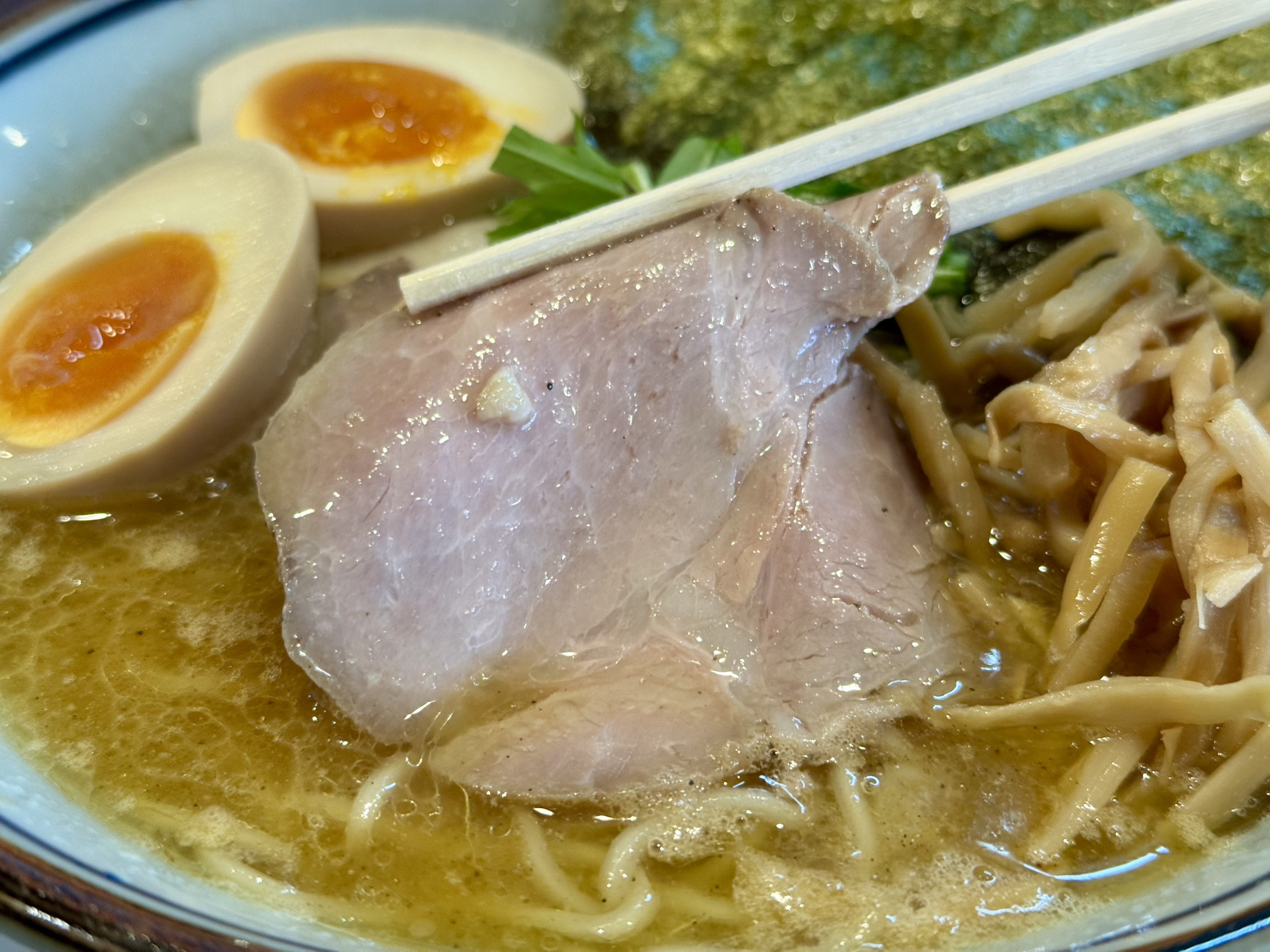 黄金色に輝くスープ、チャーシューに煮玉子、細切りメンマに海苔3枚と、美しく豪華なビジュアル。そして上品な煮干しの香りが漂います。