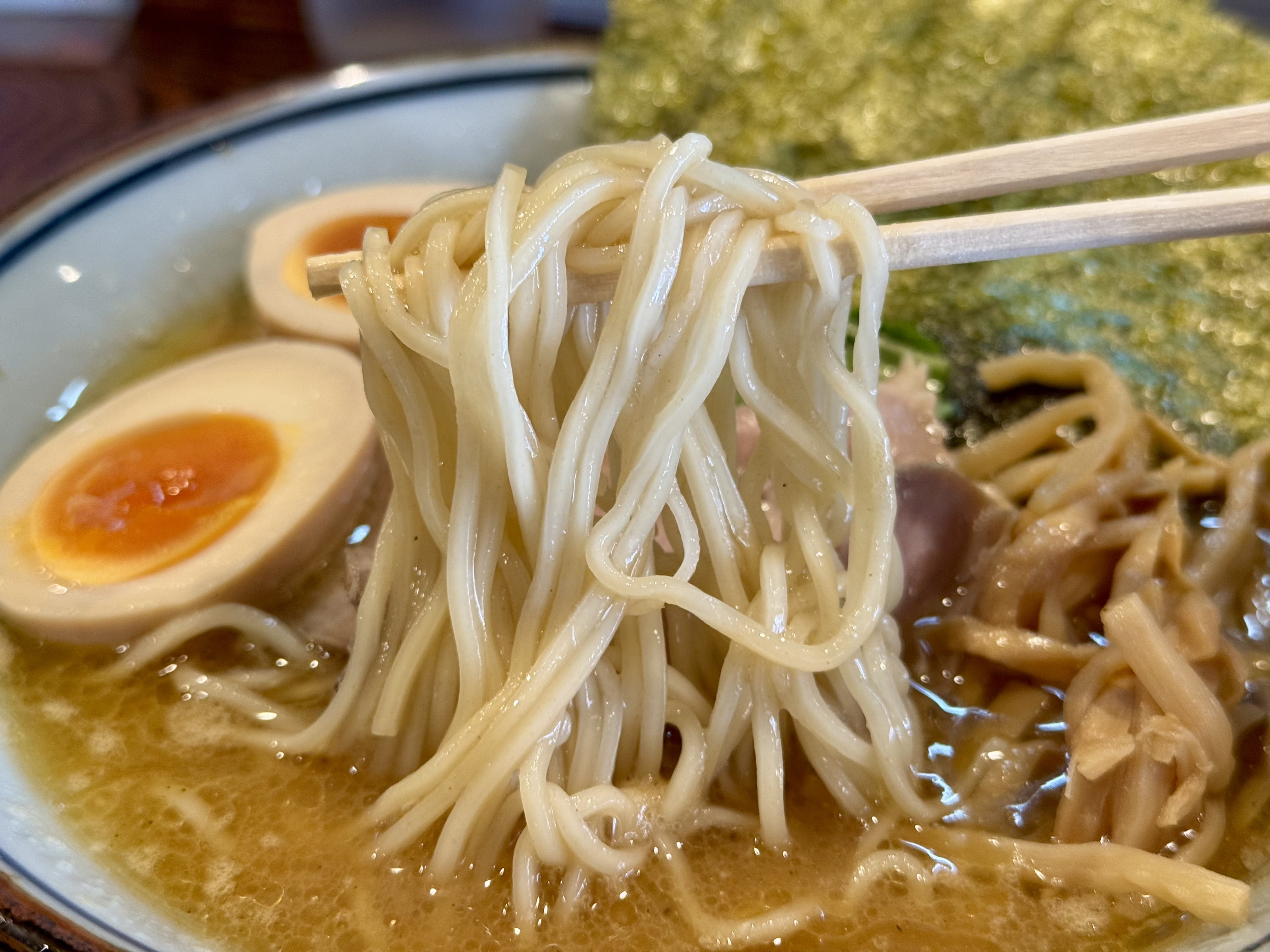 濃厚スープに合わせるのは林製麺さんに特注している中細ストレート麺。適度な弾力で啜り心地もいい。