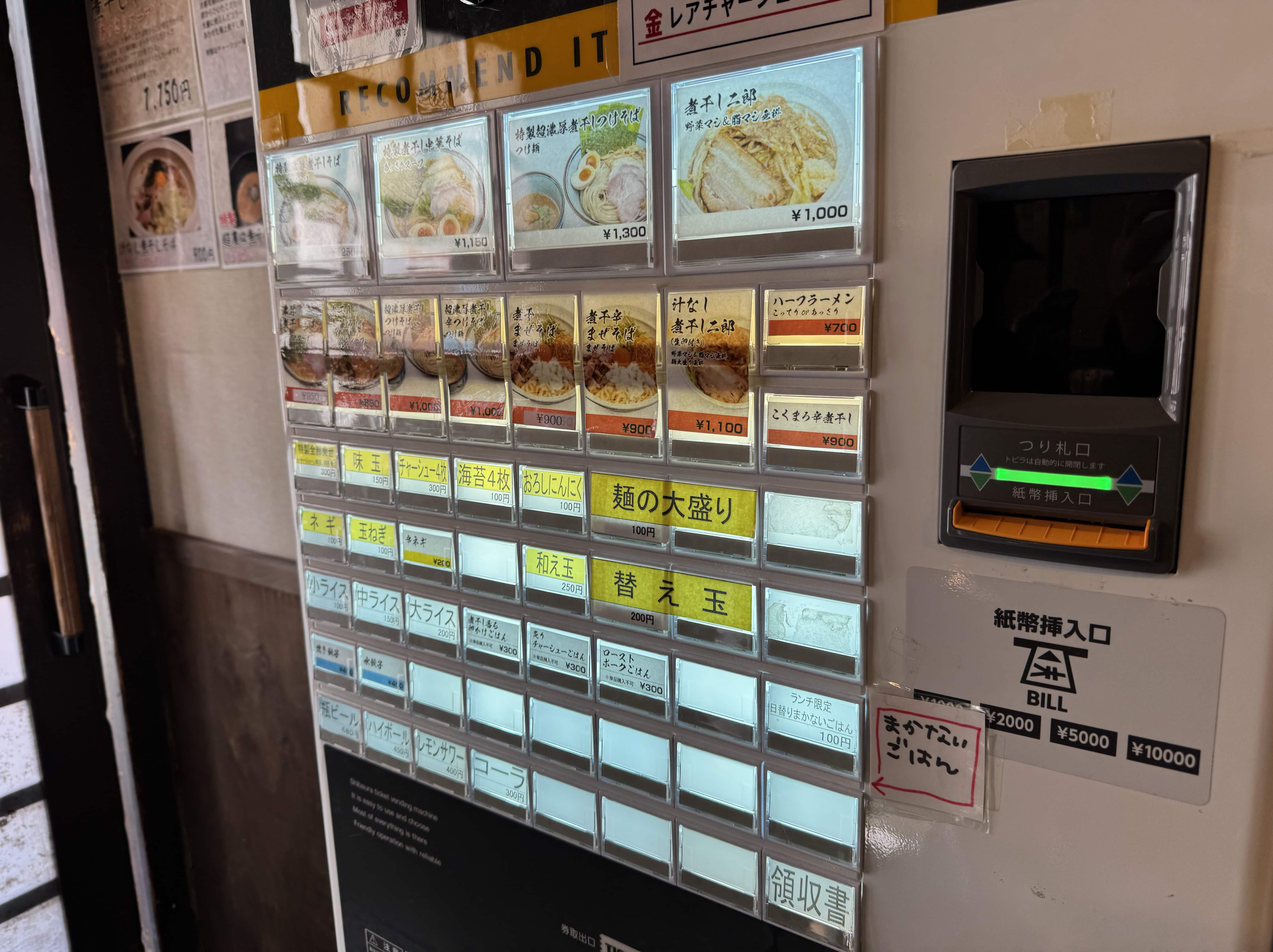 店内左手には食券機が。煮干し、濃厚煮干し、つけそば、二郎インスパイアのほか、トッピングやご飯ものが揃います。実は食券機だけを見ていると見逃してしまいそうなお得メニューが。