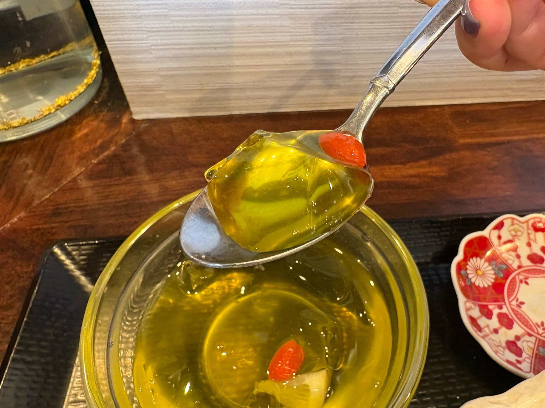 食後にいただいた愛玉ゼリーからは、レモン系シロップのお味が。さっぱりした甘さがヒリヒリとした口を癒します。