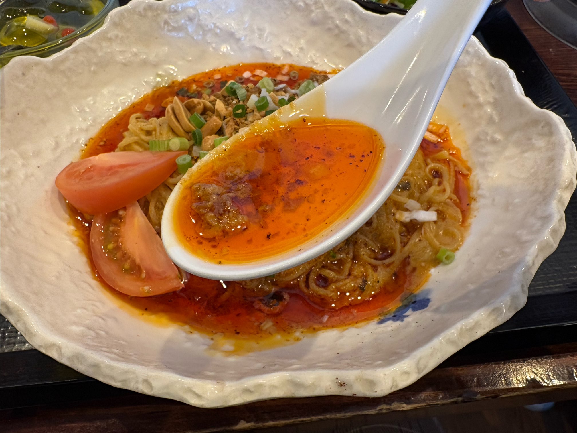 担々麺は赤々としていて、見た目だけですでに辛いです。