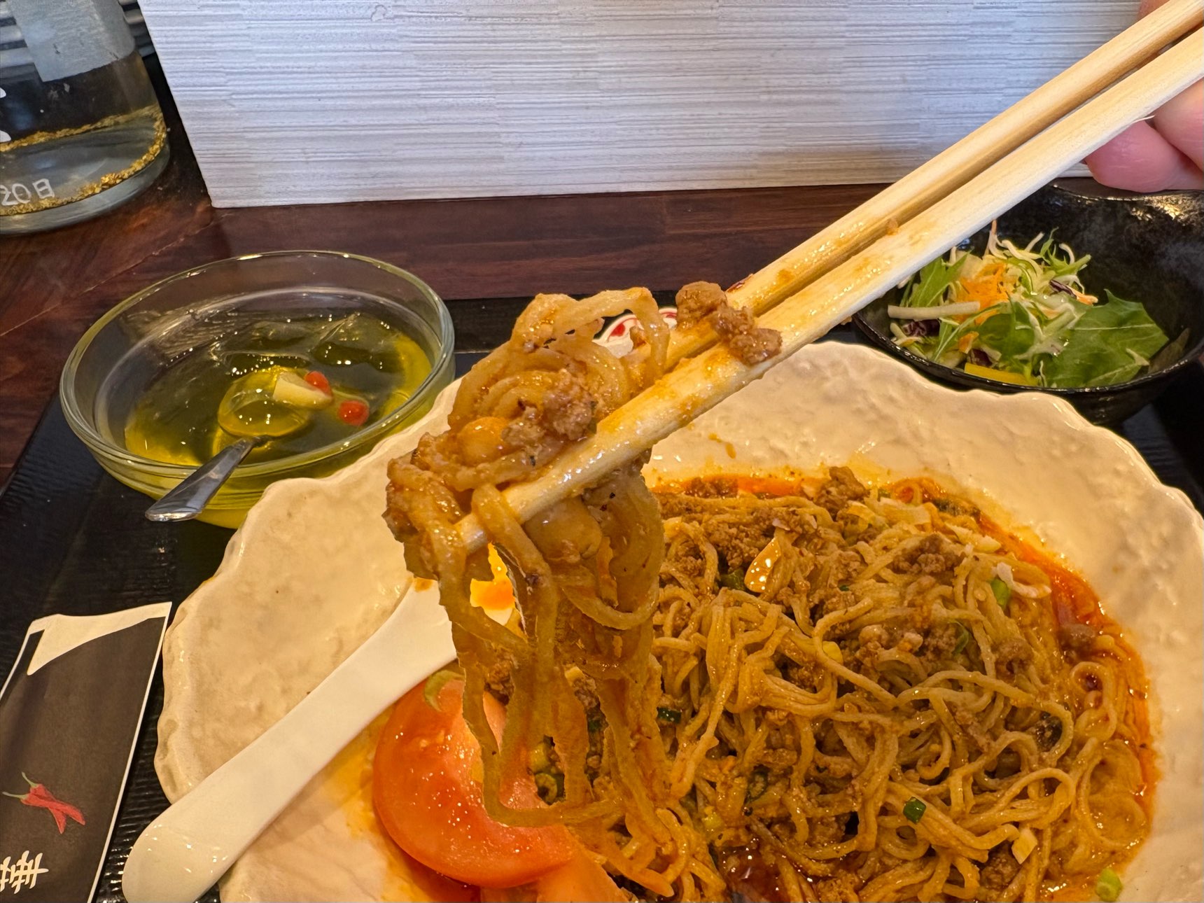 タレと麺を混ぜていただきます。店員さんがおっしゃっていた通り、タレが細麺によく絡む。ゴロゴロとした挽き肉がたまりません。食欲をそそる辛さに箸が止まらない!