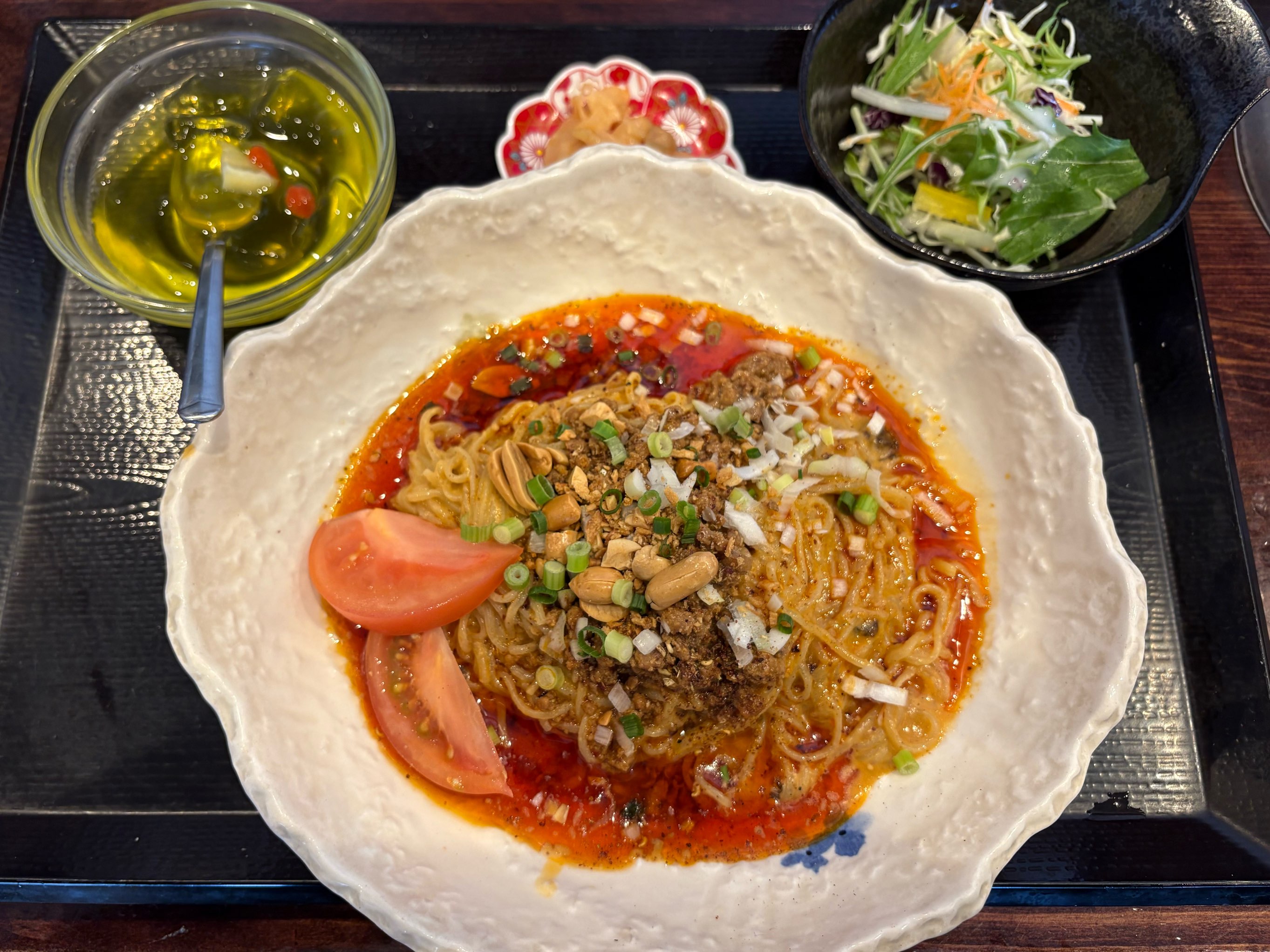 今日は前々から目をつけていた「汁なし担々麺セット」を注文しました。いつもメニュー選択に時間をかける私にしては早い決断です。