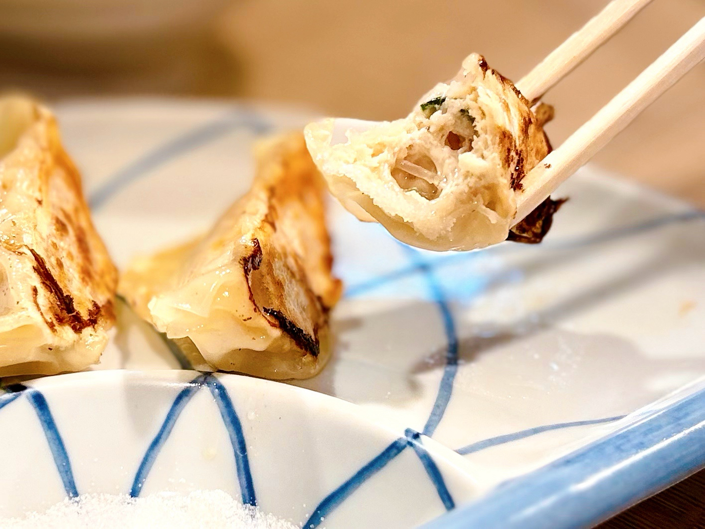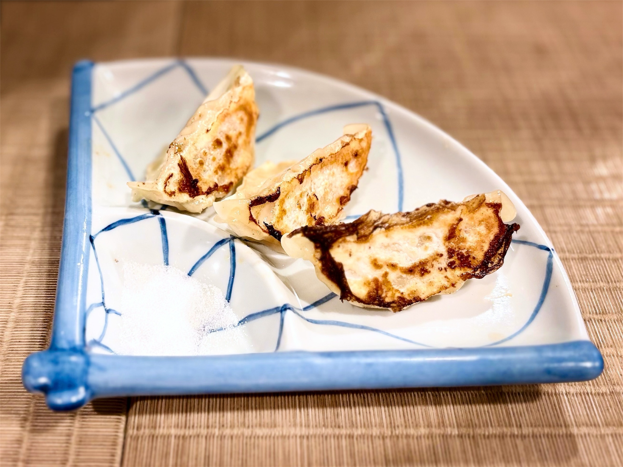 ザラリとしている塩と一緒に食べることにより、餃子の風味と旨味が増します。