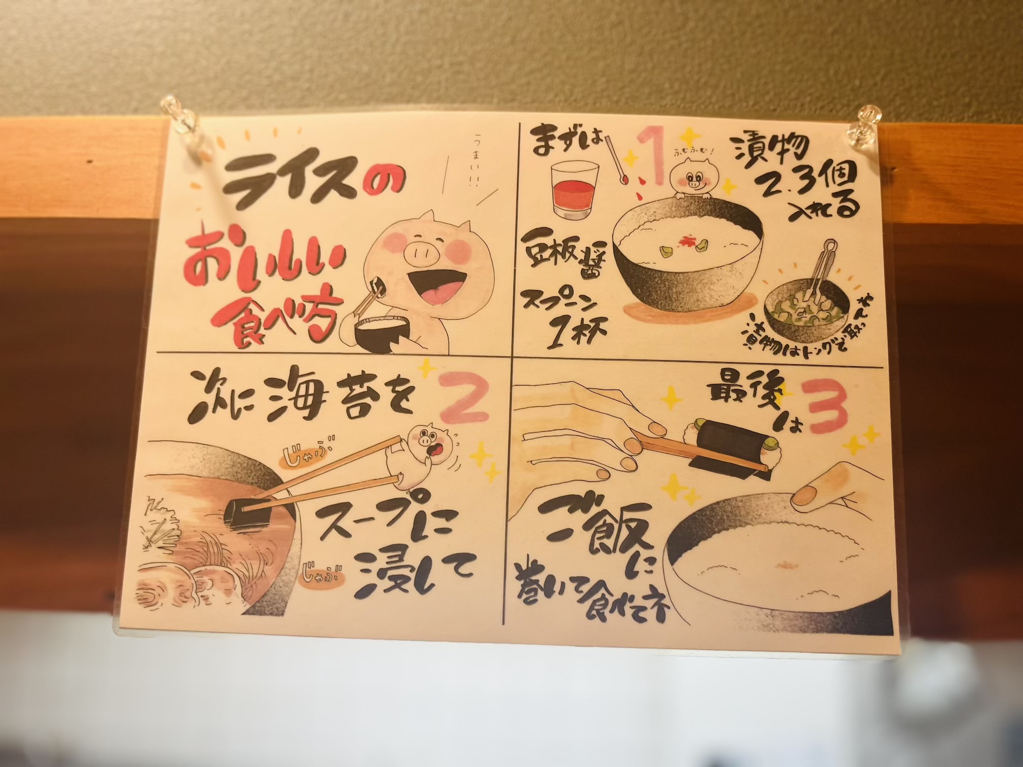 さて、ここからが家系の真骨頂。家系のためにライスがあるのか、ライスのために家系があるのかと思わせるほどの相性の良さを誇ることは有名な話。丁寧にライスのおいしい食べ方が案内されているので、ステップに沿っていただいていきましょうか。イラストのぶたさんがかわいい。