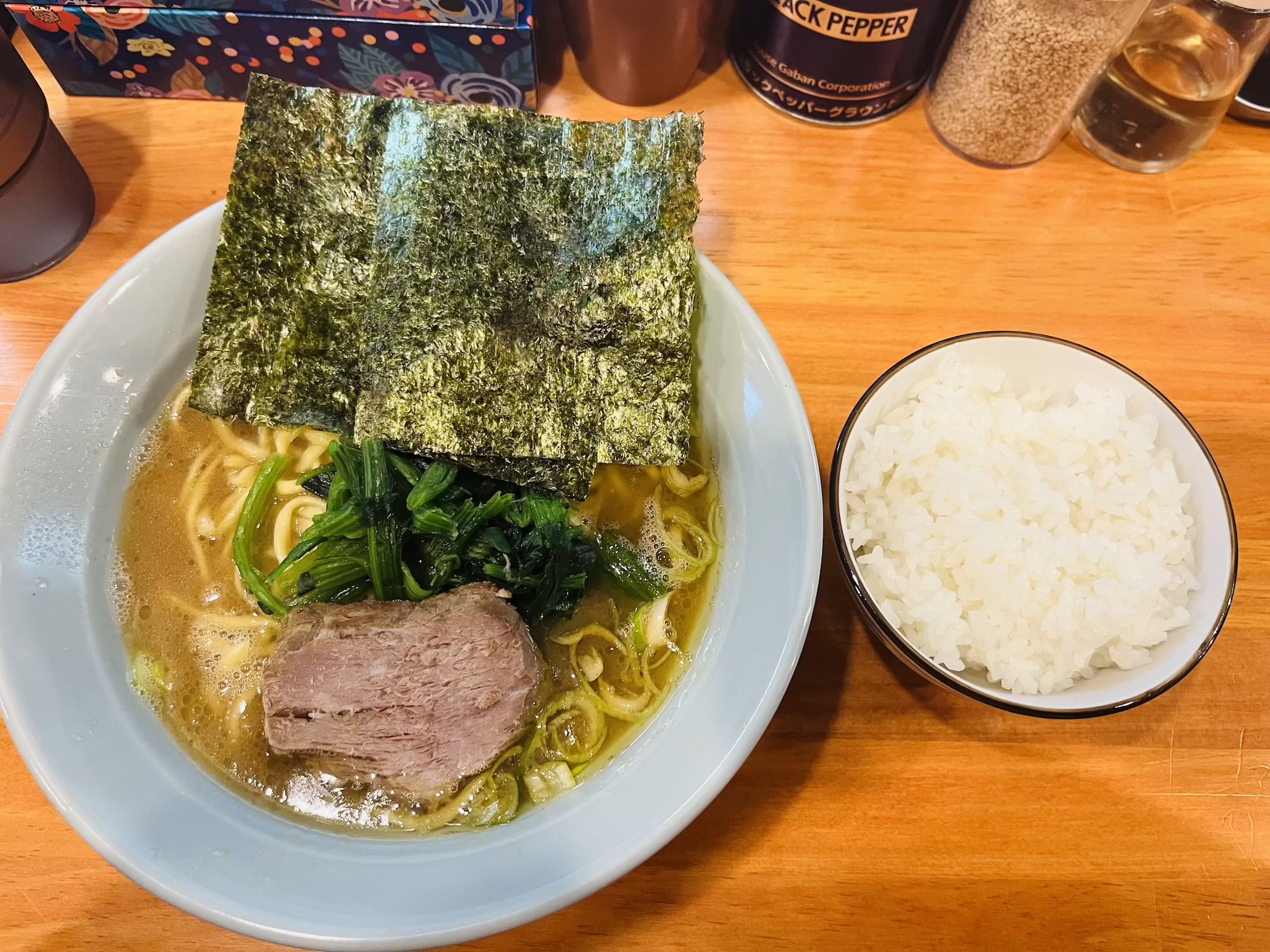 ラーメンは「しょうゆとんこつ」と「しおとんこつ」のみで、そちらに全部のせなど各種トッピングがある形ですね。この時の私は完璧に家系ラーメンの口となっていたので、その香りに食欲を刺激されながら王道のしょうゆとんこつと小ライスをプッシュ。トッピングの全部のせにしようか迷ったんですが、ライスとのバランスを考えながら啜りたかったのでノーマルのものにしました。