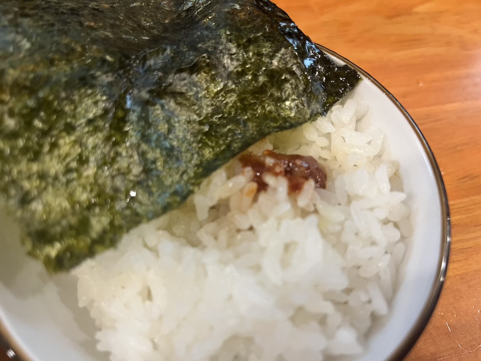 卓上の漬物と豆板醤をライスの上にオン、海苔をスープに浸し、それをご飯に巻いて喰らうべし!