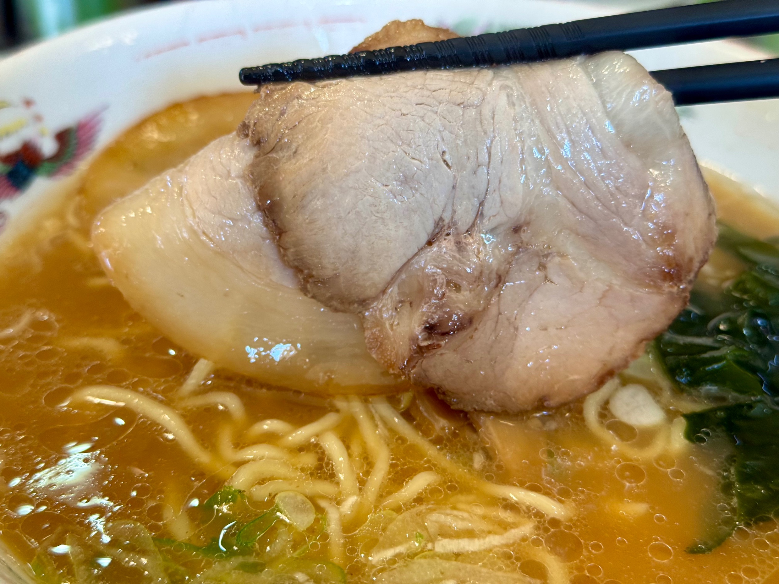 チャーシューも中まででしっかりと味が染みており、脂身はジューシーで赤身は肉肉しく、ご飯をくるんで食べるのが好き。