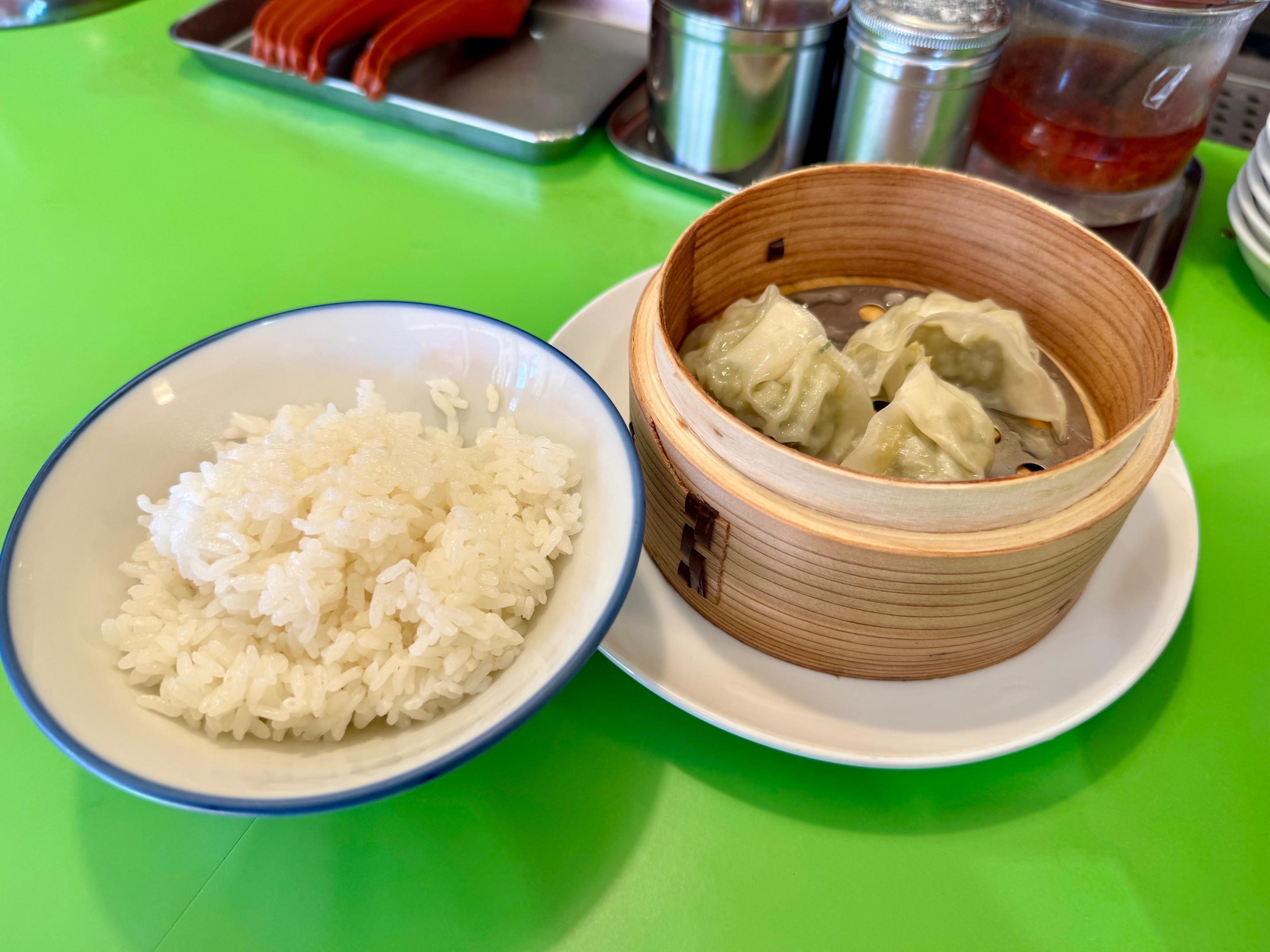 サイドメニューの蒸し餃子!(ご飯とセットで330円)焼き餃子や水餃子は聞いたことある人も多いと思いますが、蒸篭でしっかりと蒸した餃子はラーメン店ではなかなかお目にかかれない…!