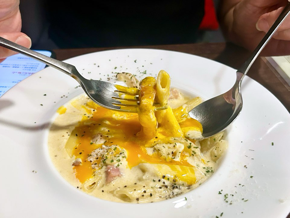 そして実は、ペンネを使ったカルボナーラは、人生初。さっそく、カルボナーラのたまごを割っていただきます!