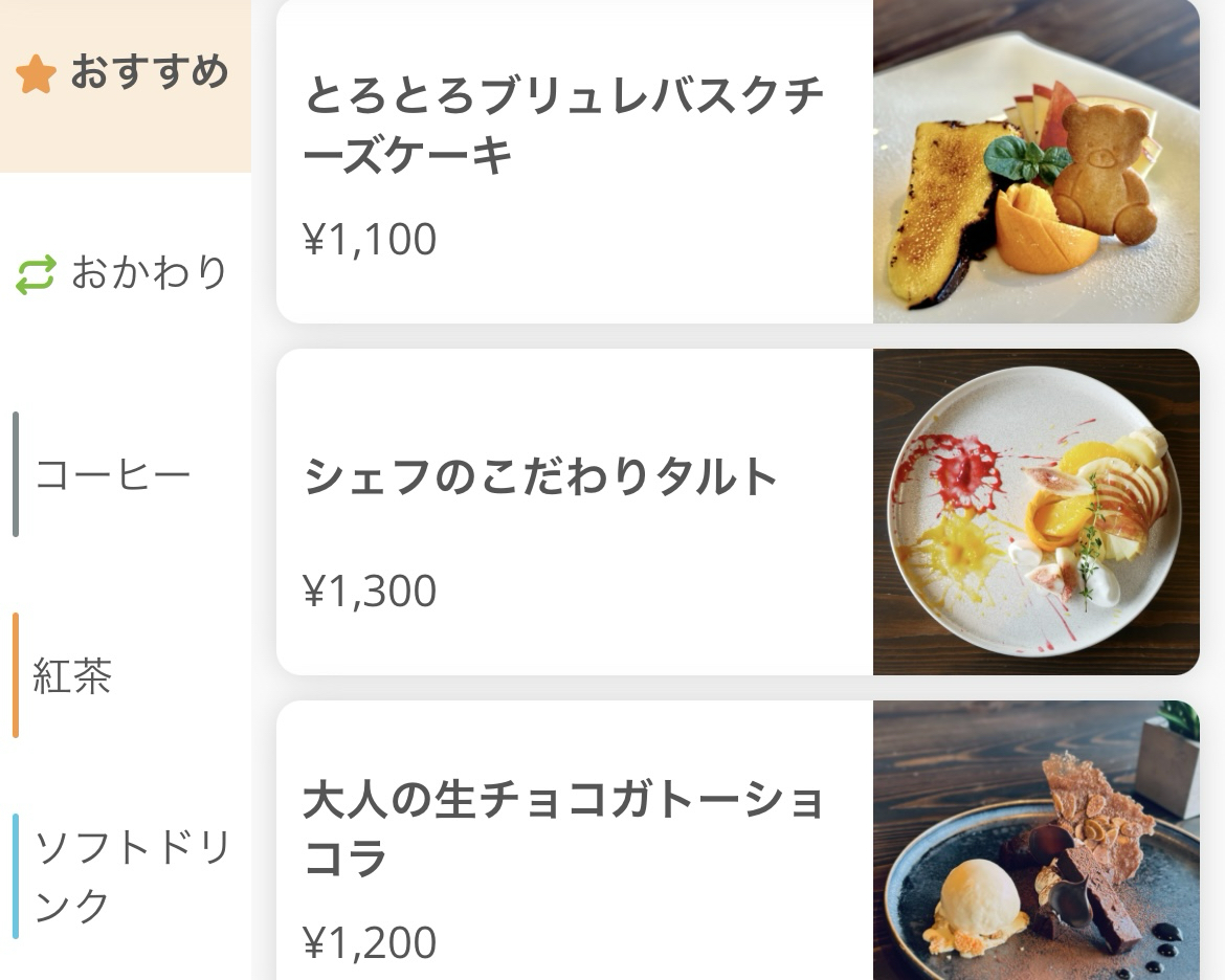 スマホの画面上では、デザートは「おすすめ」内にあります。