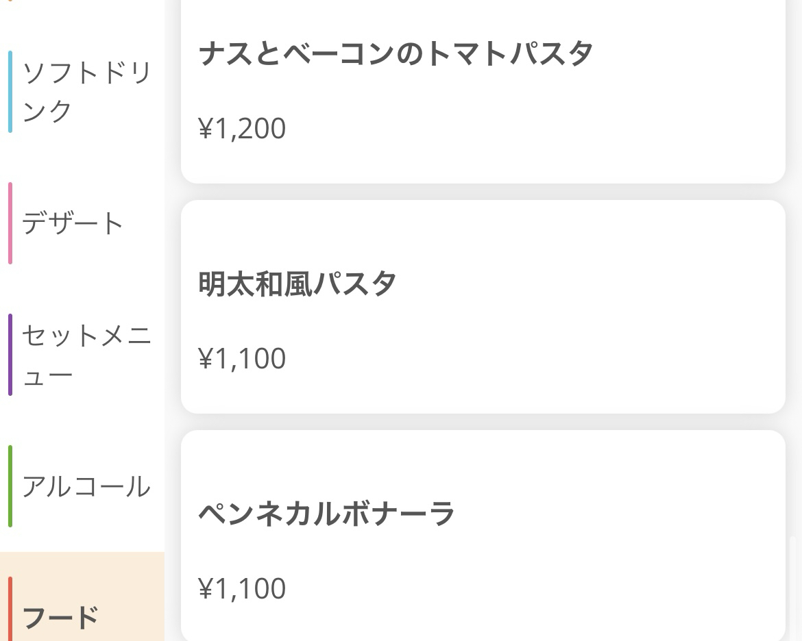 パスタのメニューはこのようになっています。写真があることでより一層食欲をそそられる…!