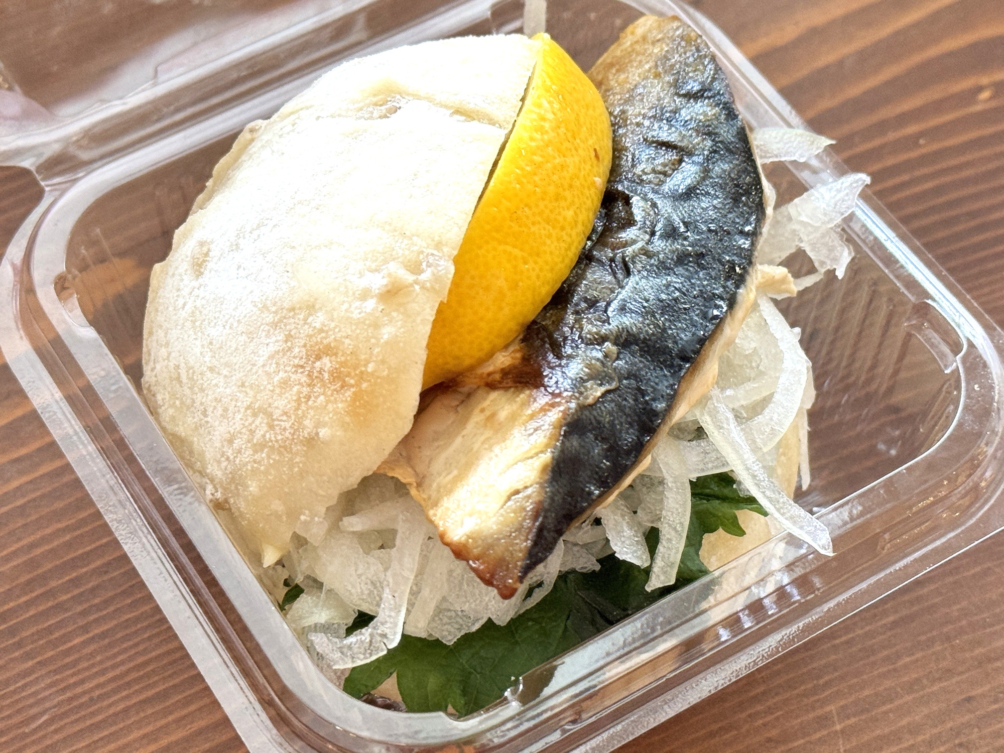 やわらかい白パンの間に挟まっているのはさっぱりとした味わいの焼き塩サバ。
