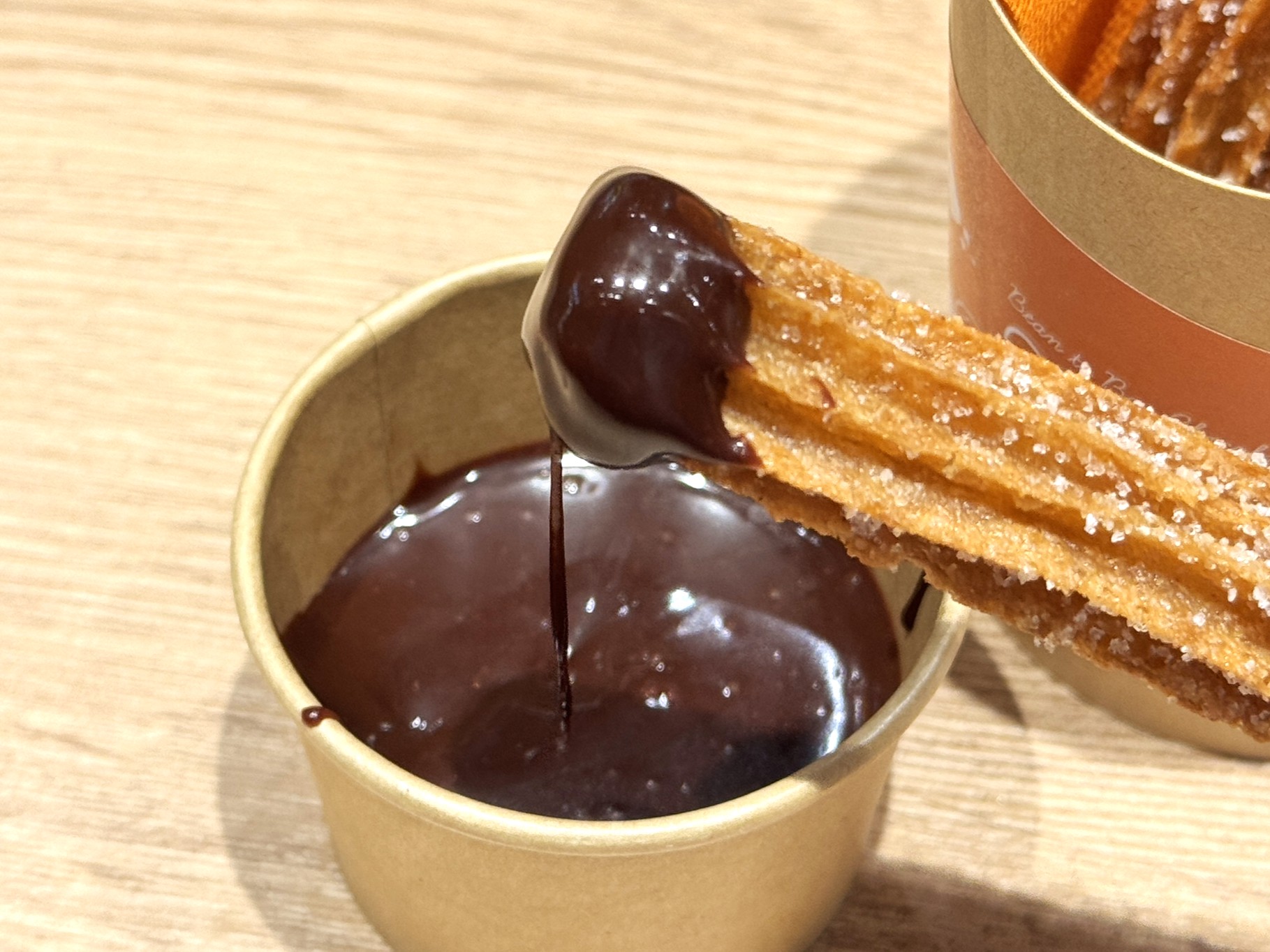 ザクザク食感のベイクドチュロスには砂糖がまぶしてありますが、ここはチョコレート専門店ということで、さらにここへたっぷりとチョコレートソースをまとわせます。
