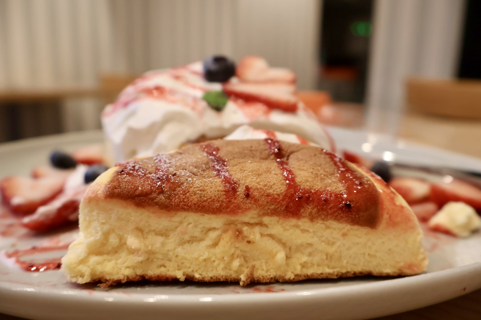 口に入れると、ふわっとしながらもしっとりと柔らかく軽い食感。まるで台湾カステラのようなシュワっと感と、パンケーキのふわふわしっとり感のいいとこどりのようなパンケーキ!