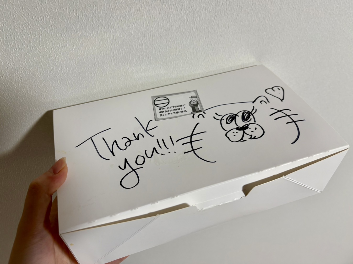 可愛らしいネコのイラストとThank you!のメッセージが書かれたボックスに入れてもらえました!