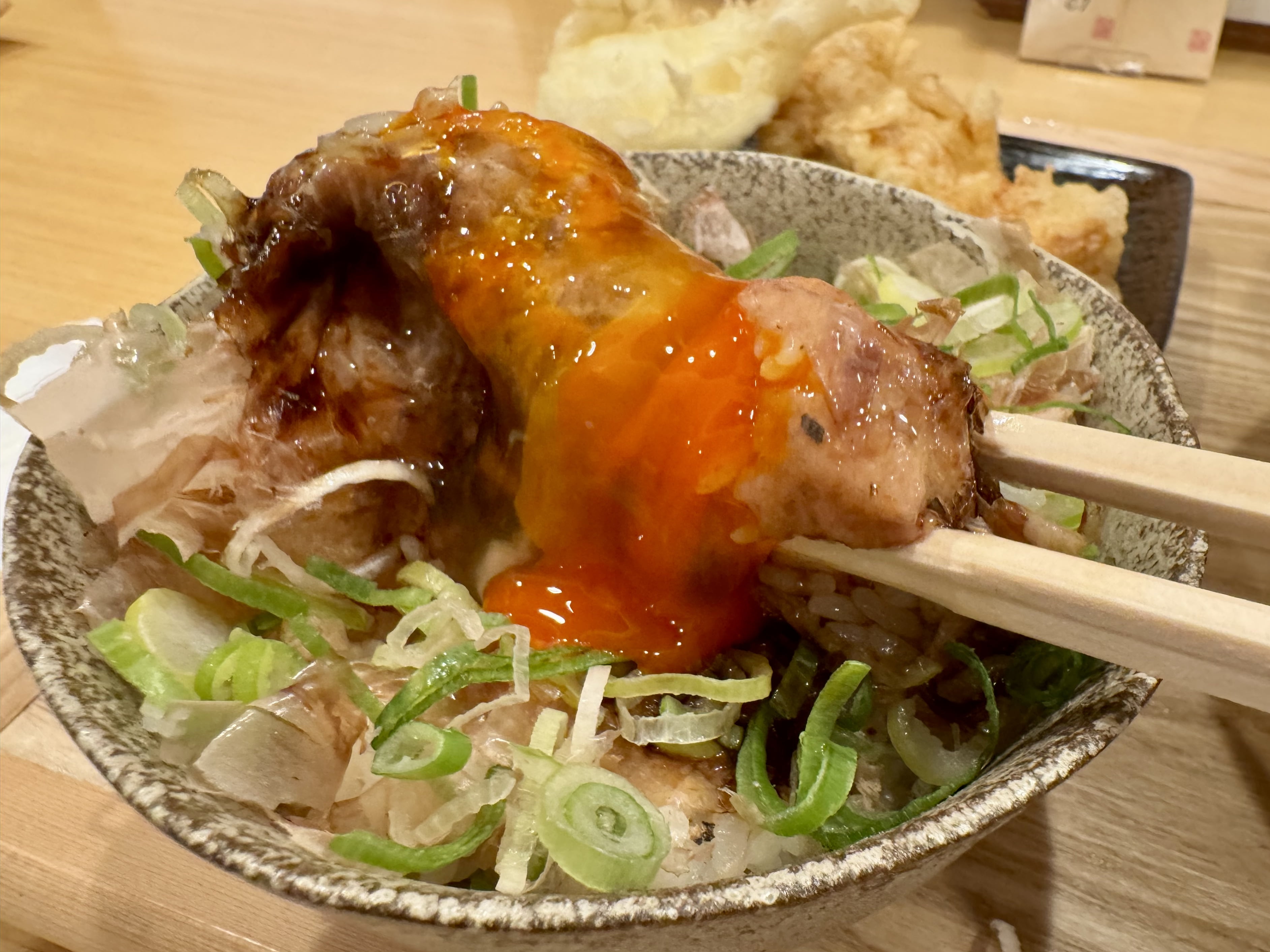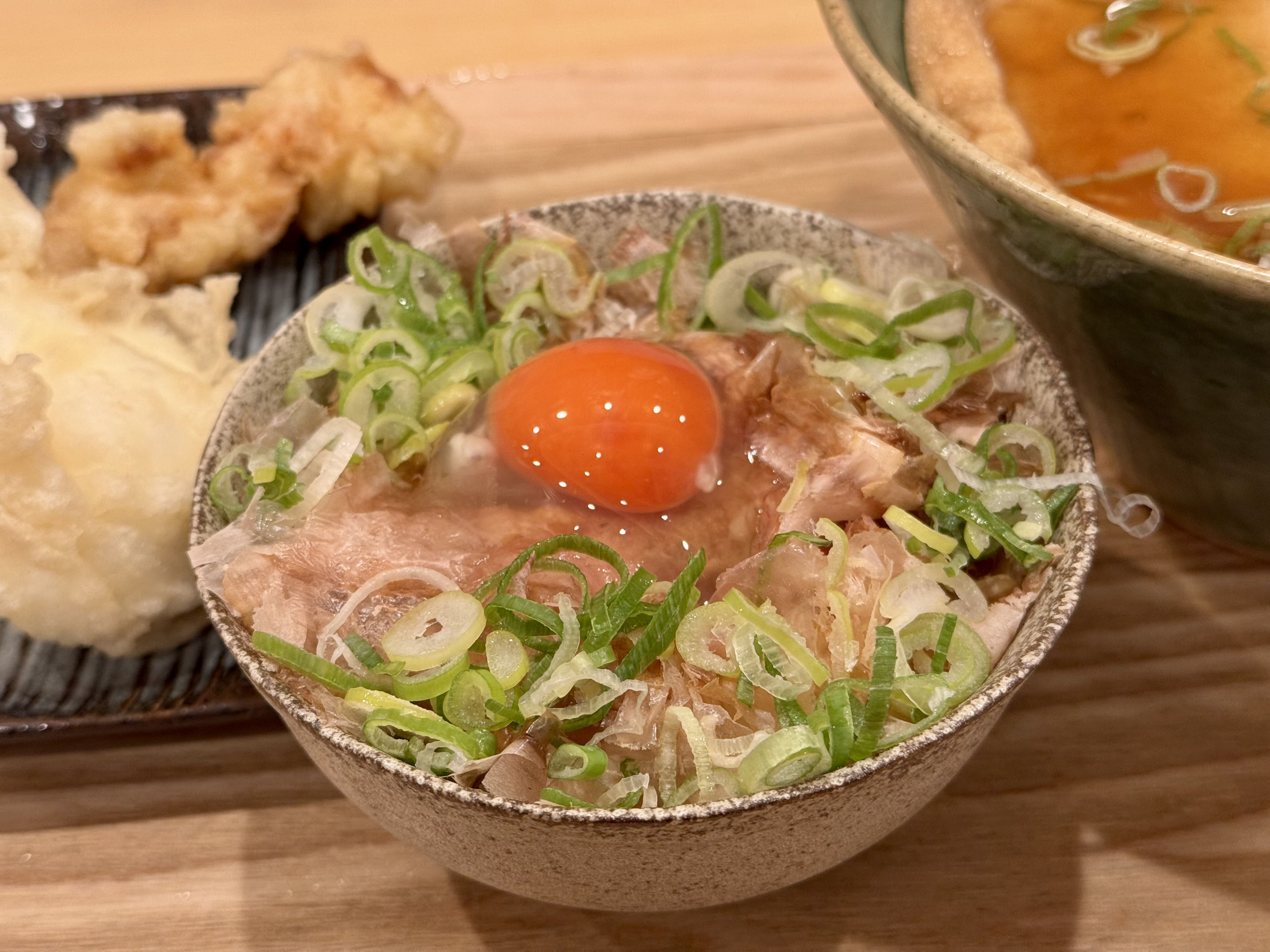 紅玉子(紅玉と言われる、殻と黄身が赤い卵)の下には鰹節とネギ。丼の中央に卵黄が乗ると、なぜこんなにも美しく、そして美味しく見えるのでしょう。ご飯の量もしっかり。食べ応えがあります。