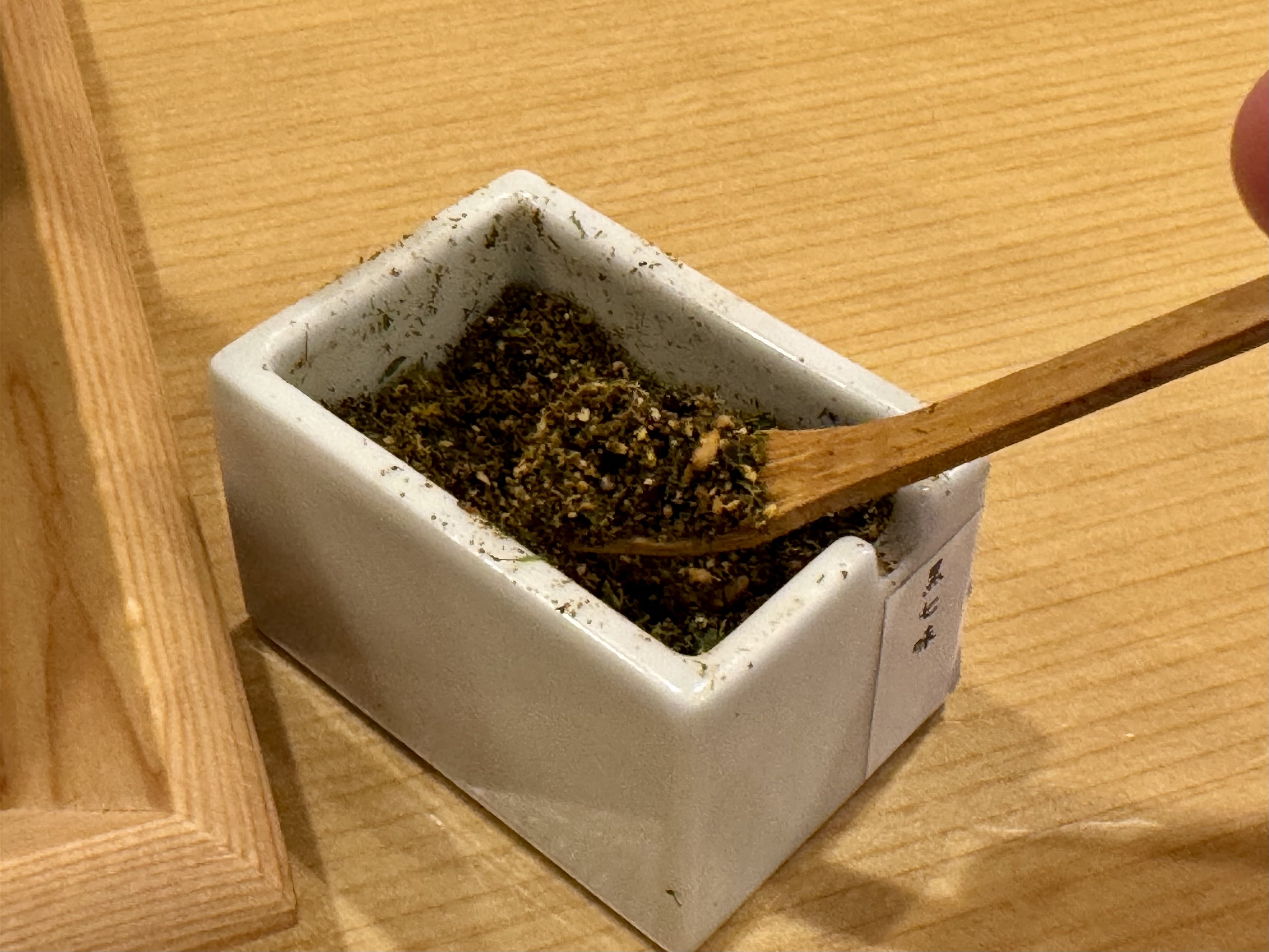 お店おすすめの黒七味。少量を出汁に入れると、柑橘系のような華やかな香りがプラスされ、ピリッとした辛さが味を引きしめます。