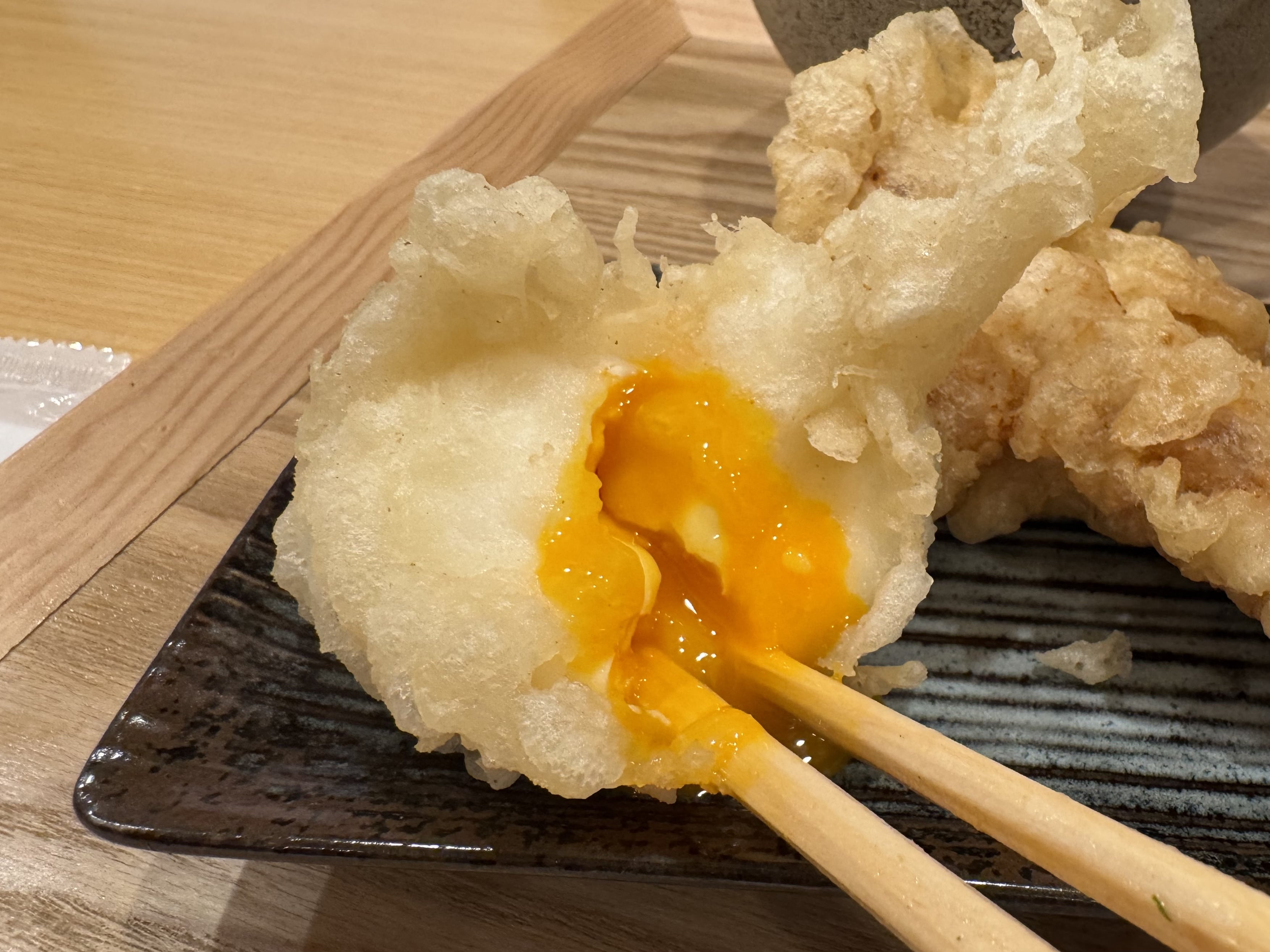 ほとんど満席の状態でしたが、着丼は5分ほどとかなりスピーディー。今回注文したのは大判きつねうどん/温、花かつお紅玉子かけごはん、そして天ぷら2品。
