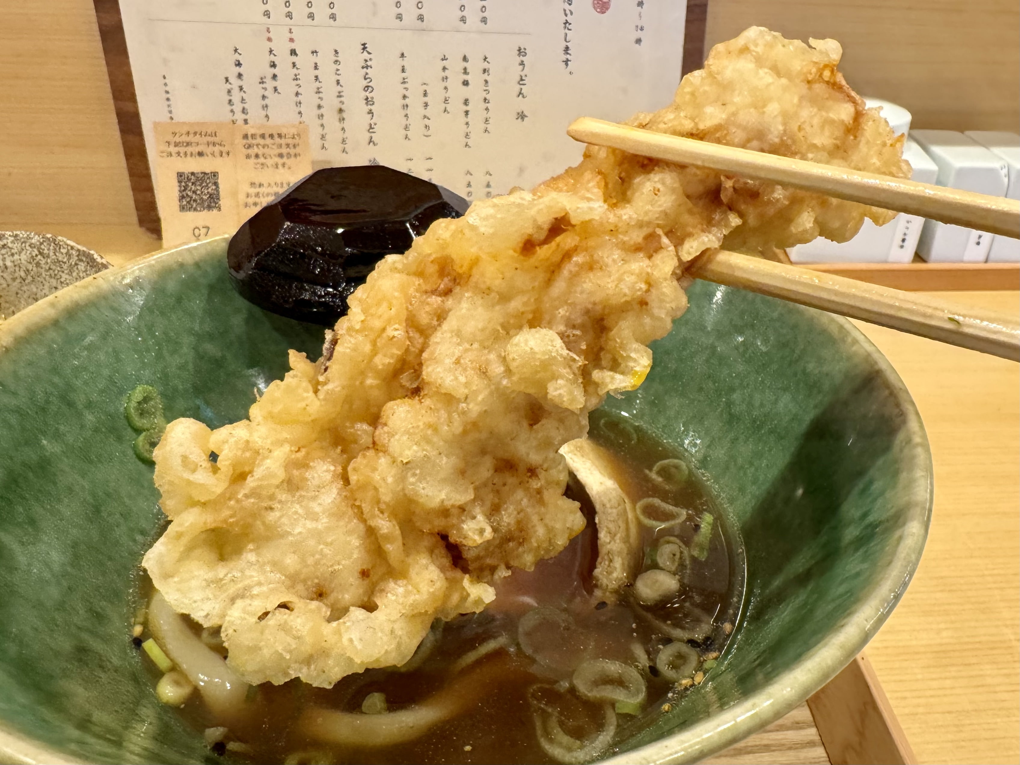 山長弥栄さんはうどん以外にも天ぷらも人気メニュー。食感を楽しみたいので、うどんの上に載せるのではなく別皿で注文しました。