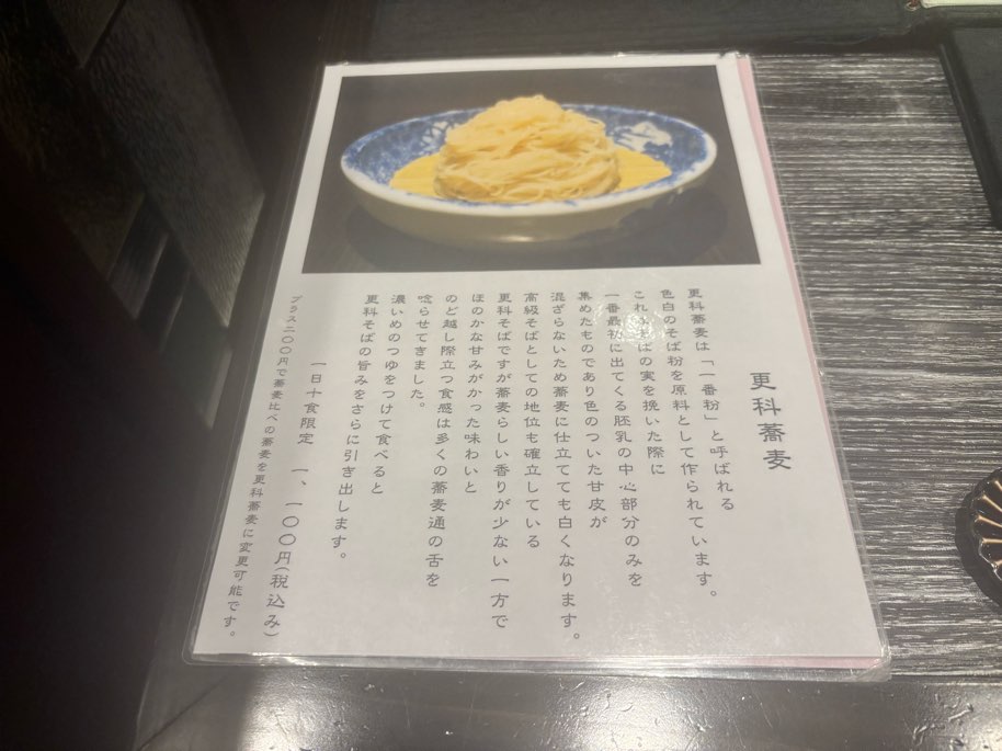 更科蕎麦とは、「胚乳の中でも白くきめ細かい一番粉だけを使った高級そば」とのこと。