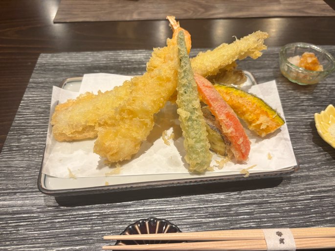 注文して20分弱ほどで天ぷらが到着。海老・穴子・舞茸・かぼちゃ・パプリカ・オクラ・ナスがのった豪華なセットです。